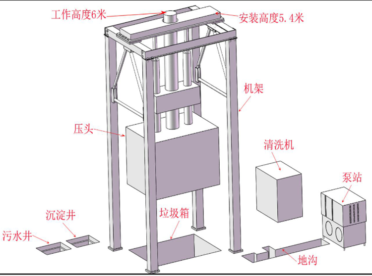5.設(shè)有垃圾儲存箱,適合集裝箱式散裝垃圾運輸車卸料,減少運輸費用。